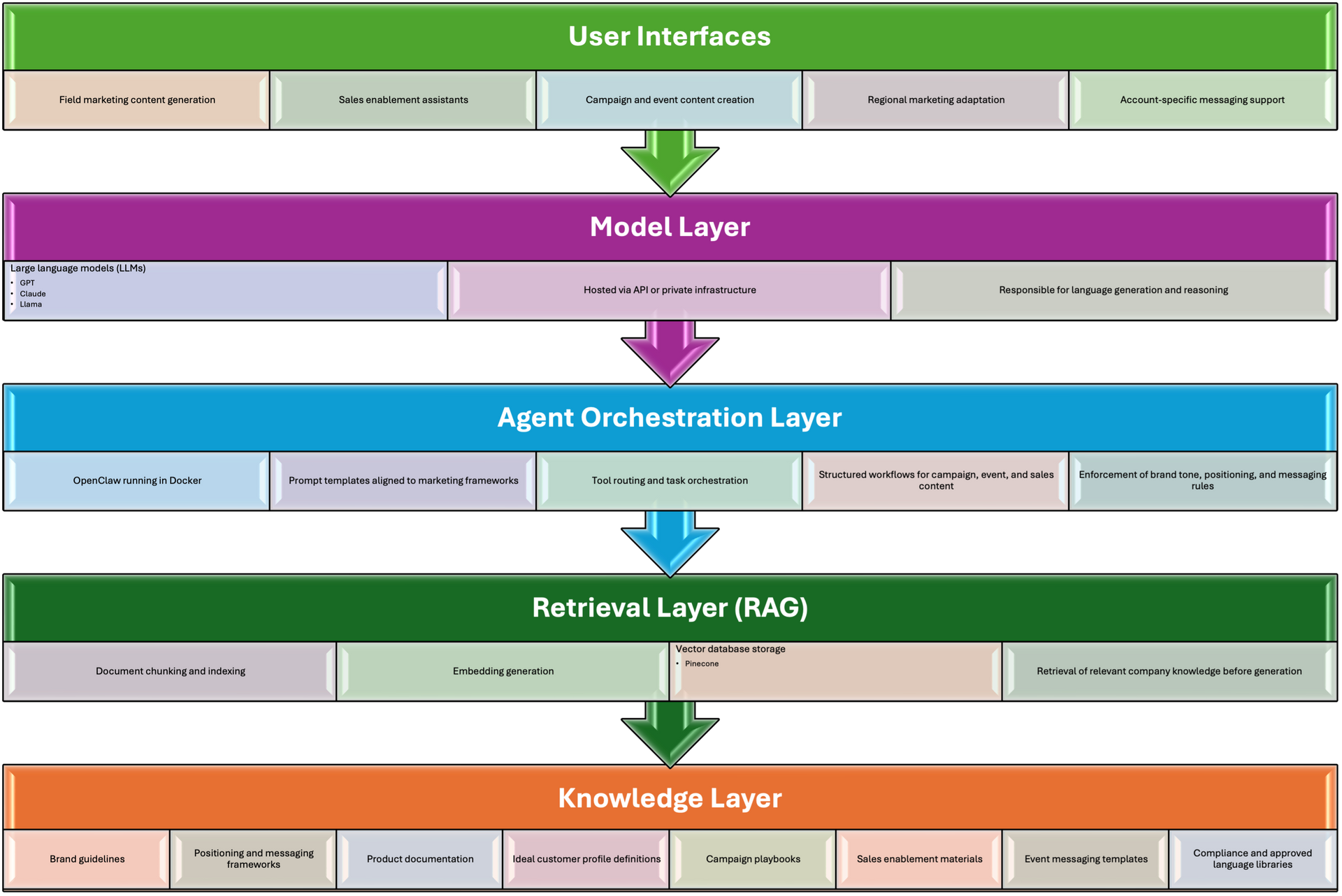 Instead of storing customer information, the system stores marketing expertise. Positioning frameworks, messaging logic, and campaign playbooks become operational assets that the organization can deploy instantly.